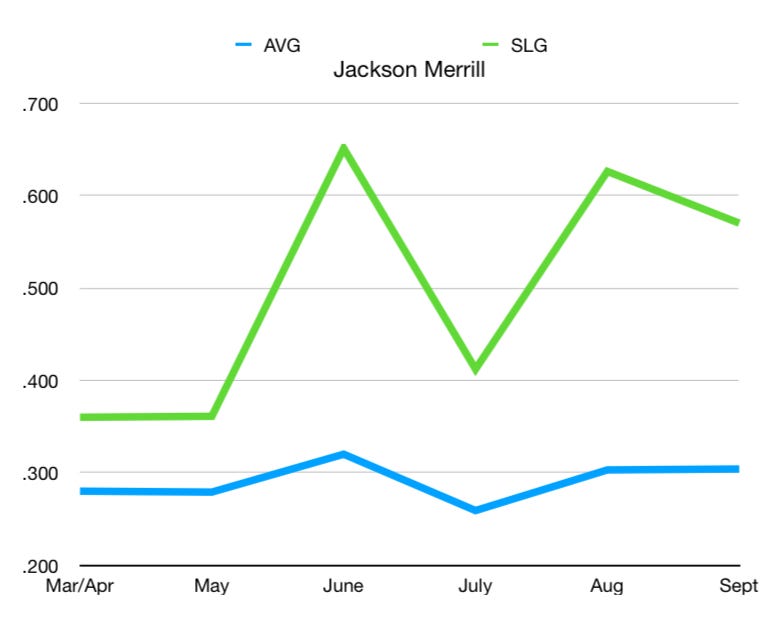 Merrill is one of the three Jacksons to grace a big-league lineup before reaching legal drinking age this season. Check out his month-by-month batting average and fluctuations in slugging percentage: