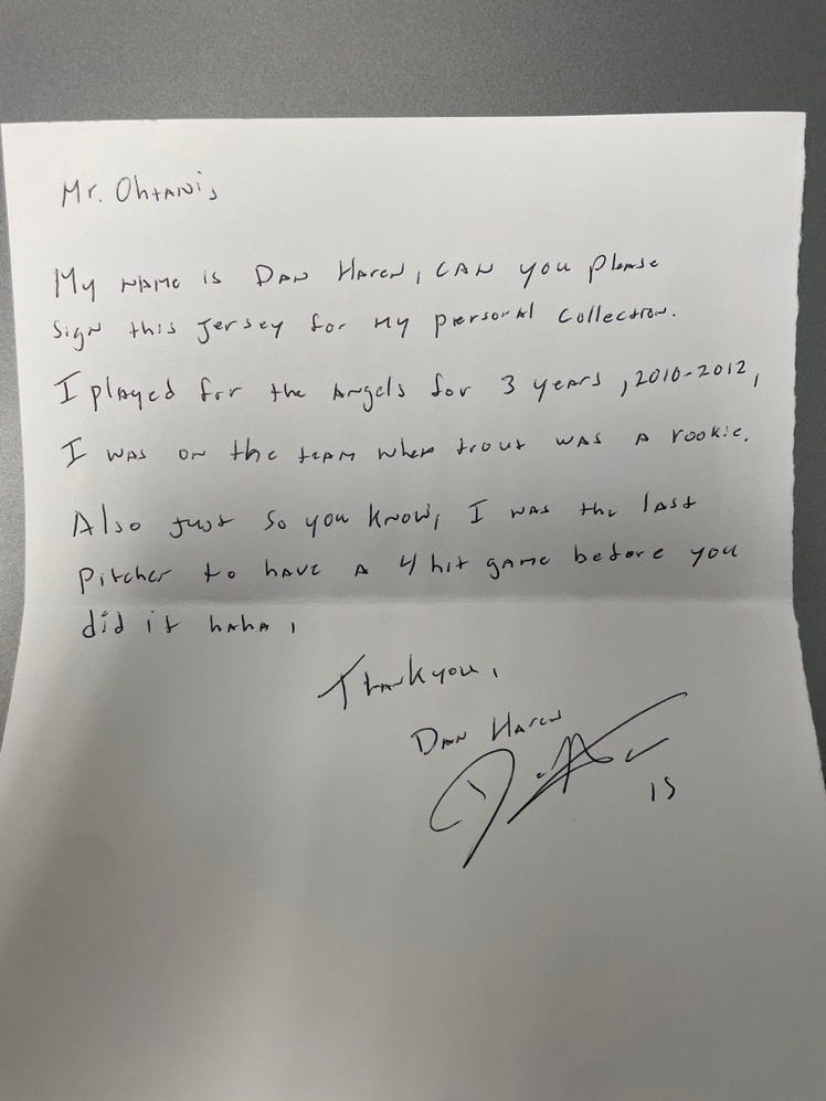 Back in August, Haren sent the letter pictured above — along with a jersey he had purchased — to the home clubhouse at Angel Stadium. His words are genuine, sweet, respectful, and funny. Until he starts listing his credentials, there’s no reason to believe the note wasn’t written by a nine-year-old kid who idolizes the two-way player. That’s no knock on a Pepperdine education. Ohtani has that power; he can turn a three-time All-Star with more than 150 Major League victories into a childlike fan.